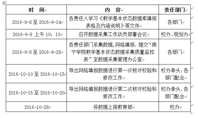 为贯彻落实《教育部关于普通高等学校本科教学评估工作的意见》(教高〔2011〕6号)和自治区教育厅《关于开展2016年全区高校本科教学基本状态数据采集工作通知》(桂教办〔2016〕591号)的要求,我校必须于2016年10月30日前完成教学基本状态数据的采集和上报工作,此项工作涉及面广,数据采集量大,时间紧、任务重,为确保工作高效有序推进,现就相关事项通知如下: