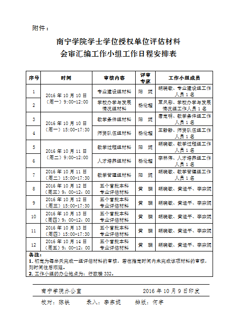 三、会审汇编工作小组工作安排:2016年10月14日前,各评估专项组成员配合审核专家共同做好学士学位评估材料的审核和编制工作,具体工作日程安排详见附件。