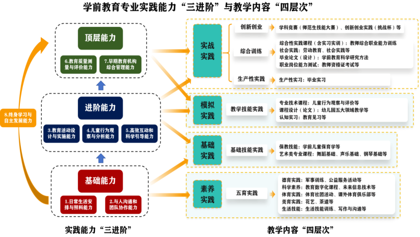 (二)实践教学体系特色鲜明,产教融合育人模式深度夯实。 以OBE理念为引领,构建并实施了层次分明、特色突出的“四层次”实践教学体系,即“素养实践(五育培养)—基础实践(保教与艺术技能)—模拟实践(教学与观察训练)—实战实践(综合应用与岗位能力)”。通过精心设计的课程、活动、实习等模块,系统化培养学生从沟通协作到教育管理的8项核心实践能力,实现理论学习与实践应用的无缝衔接。校内实训条件完备,已建成多功能实训室群,充分保障了日常教学与模拟实践需求。校外实践基地建设成效显著,与南宁市邕宁区大地维伯幼儿园等10余所优质幼儿园共建了稳定的实习实训基地,构建了从“认知见习”(初步感知)到“跟岗研习”(深入体验)再到“顶岗实习”(综合应用)的递进式实践培养体系,确保学生从入学起即能接触真实保教场景,在实践中逐步积累岗位经验,为高质量就业奠定坚实基础。